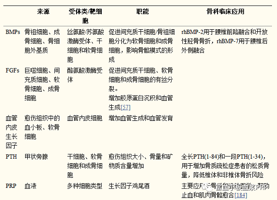 大多數(shù)骨移植替代物不具有任何骨誘導(dǎo)特性。增強(qiáng)這些骨替代物的骨愈合能力主要依賴于骨傳導(dǎo)手段。一般來(lái)說(shuō),骨替代品的骨傳導(dǎo)會(huì)促進(jìn)祖細(xì)胞的遷移和支持,祖細(xì)胞會(huì)分泌生長(zhǎng)因子來(lái)刺激骨形成。然而,在破壞愈傷組織形成的理想環(huán)境的情況下,生長(zhǎng)因子的分泌缺失,從而容易延遲愈合甚至不愈合. 同時(shí),骨愈合過(guò)程中骨損傷部位對(duì)骨誘導(dǎo)因子的需求也至關(guān)重要。因此,直接應(yīng)用生長(zhǎng)因子,其中一些參與骨損傷的自然愈合過(guò)程,也被廣泛研究并被臨床接受為一種治療策略。必須注意的是,只有少數(shù)生物因子,如 BMPs、成纖維細(xì)胞生長(zhǎng)因子 (FGF)、血管內(nèi)皮生長(zhǎng)因子 (VEGF)、PTH 和富血小板血漿 (PRP),經(jīng)過(guò)嚴(yán)格的臨床前試驗(yàn)和臨床試驗(yàn)。